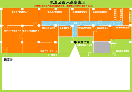 (4) 入退室時には、 「低温室利用記録簿」 記入と、 入退室表示板表示を厳守・徹底してください。