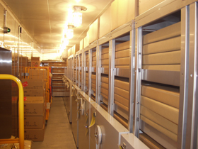 試料貯蔵室は、南極のドームふじ氷床深層コアや、みずほ中層コア、それにグリーンランド氷床コアをはじめとする極域各地で採取された雪氷コア試料、生物・医学試料や海底堆積物等の貯蔵をおこないます。貯蔵試料の内訳や、それぞれの保存に必要な温度に応じて下記の6室が設置されています。共通仕様として、移動式の棚が設置されています。強制対流方式で冷却を実施しています。貯蔵空間であるものの、極地観測用機器などの長期低温設置実験等も可能です。