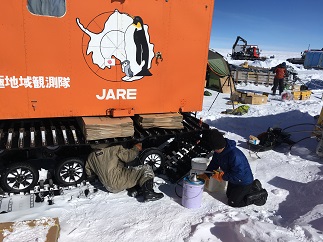 写真2:車両のグリースアップをする金子さん(設営・車両担当)