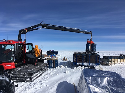 写真5:燃料ドラムの整理。クレーンの操作は伊藤さん(設営担当