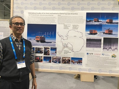 この2月に終えた南極観測の成果を発表するポスターの前で(筆者)。レーダ観測の結果を実施報告および速報として示しました。