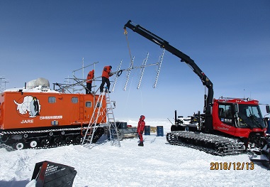 クレーンでアンテナを雪上車に搭載後、初期固定をした段階です。