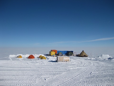 堂に使用している車両と浅層アイスコア掘削場。作業テント。他の橇や車両が居